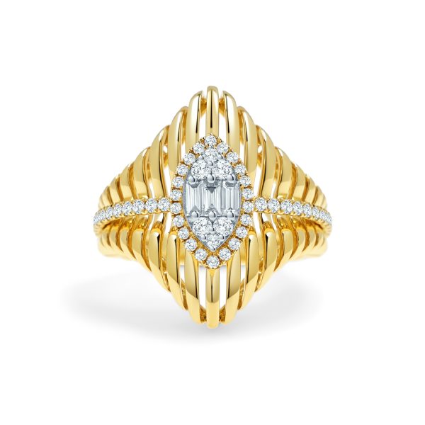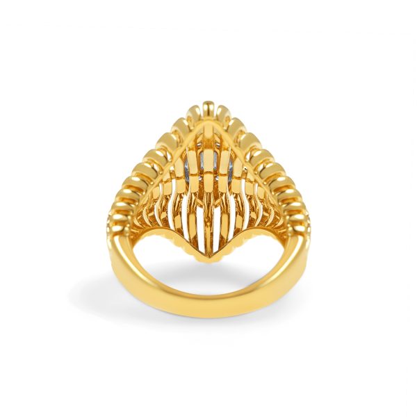 NZD $5,889Behold this resplendent Marquise Cage ring, a masterpiece where 53 diamonds, totaling 0.571 carats, dance like celestial sparks within an intricately crafted golden cage. The… -