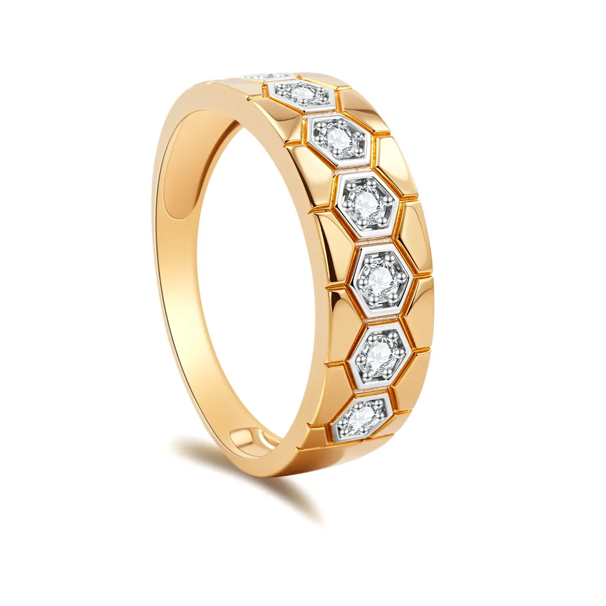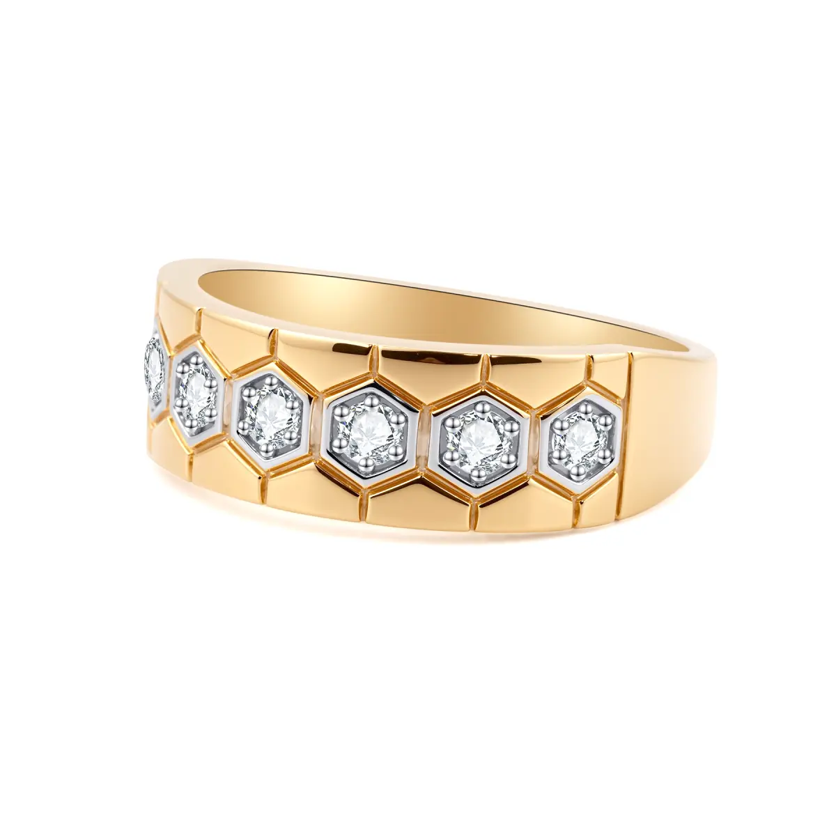 This ring showcases a distinctive design with a gold band featuring a hexagonal pattern. Each hexagon is meticulously set with a diamond, creating a striking and geometrically – inspired look that combines luxury with a modern, edgy aesthetic.