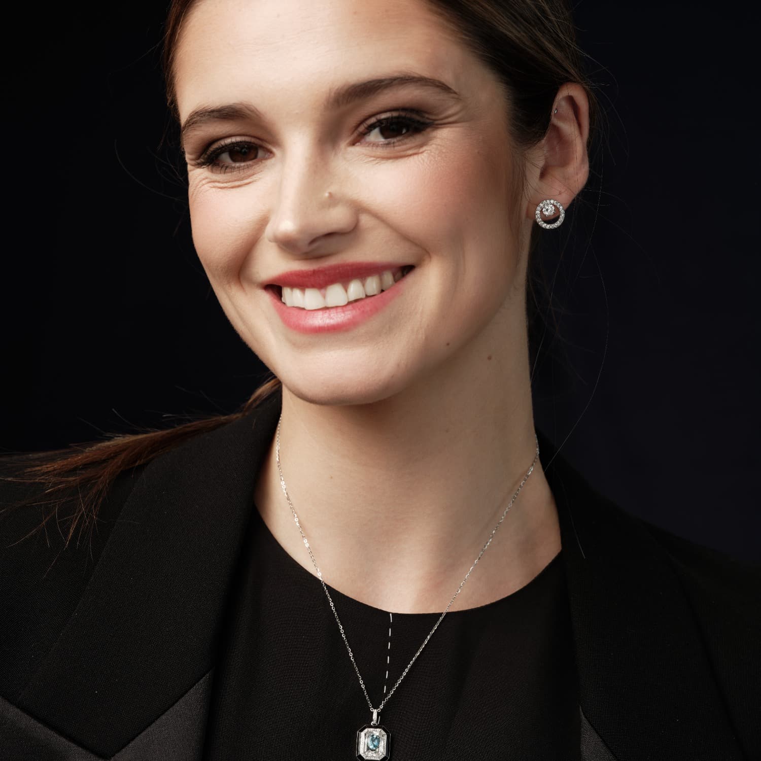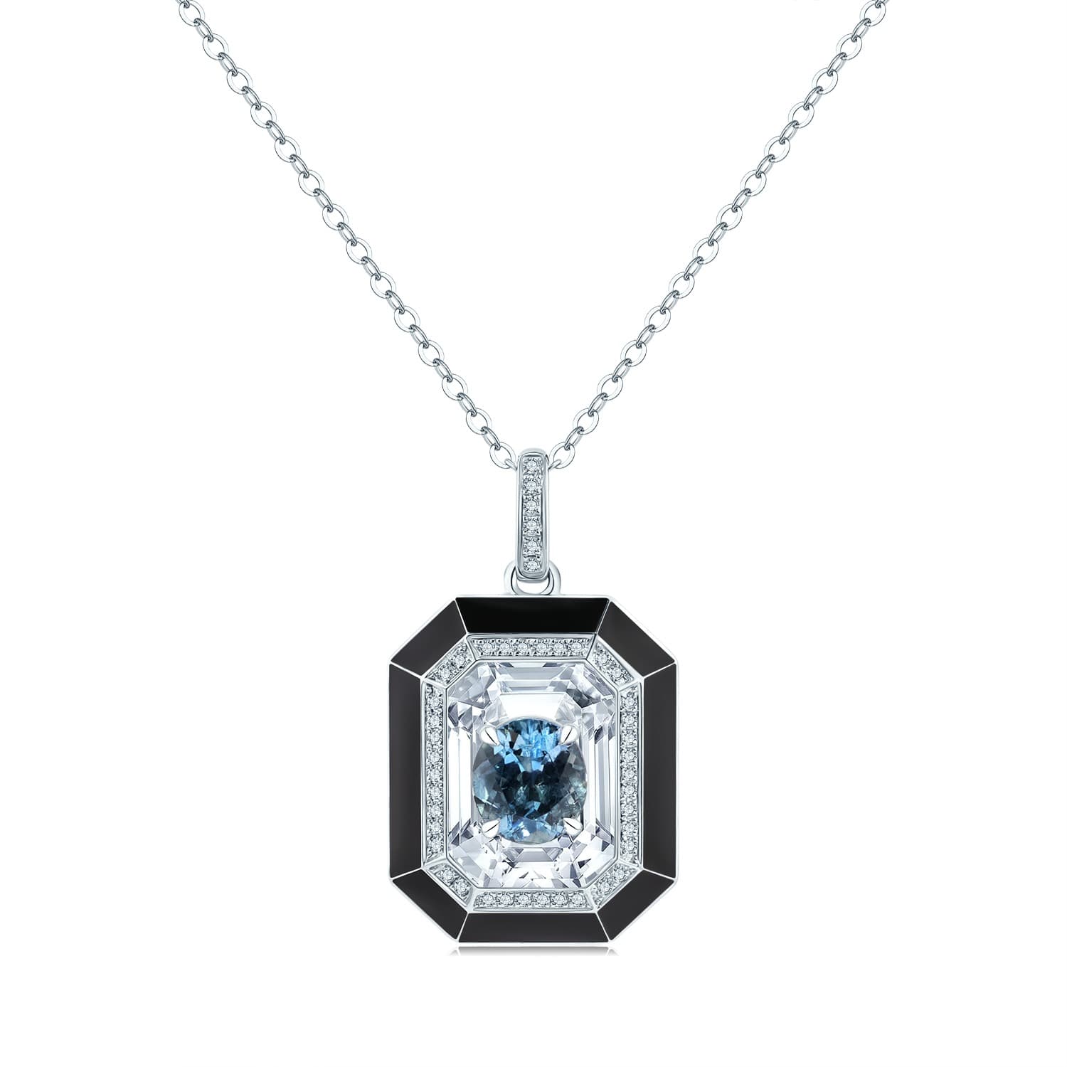 This necklace features a pendant with a striking Art Deco design. At its heart is a round – cut aquamarine, delicately set in a “stone – on – stone” fashion. The unique crystal base beneath the aquamarine features a distinct cut, enhancing the gemstone’s allure and adding an extra dimension of sparkle. The outer frame is crafted from black onyx, forming an octagonal shape, which contrasts sharply with the gemstones. This onyx border is adorned with small diamonds, adding a touch of sparkle. The sleek lines and geometric shapes are hallmarks of Art Deco style, creating a piece that’s both elegant and timeless.