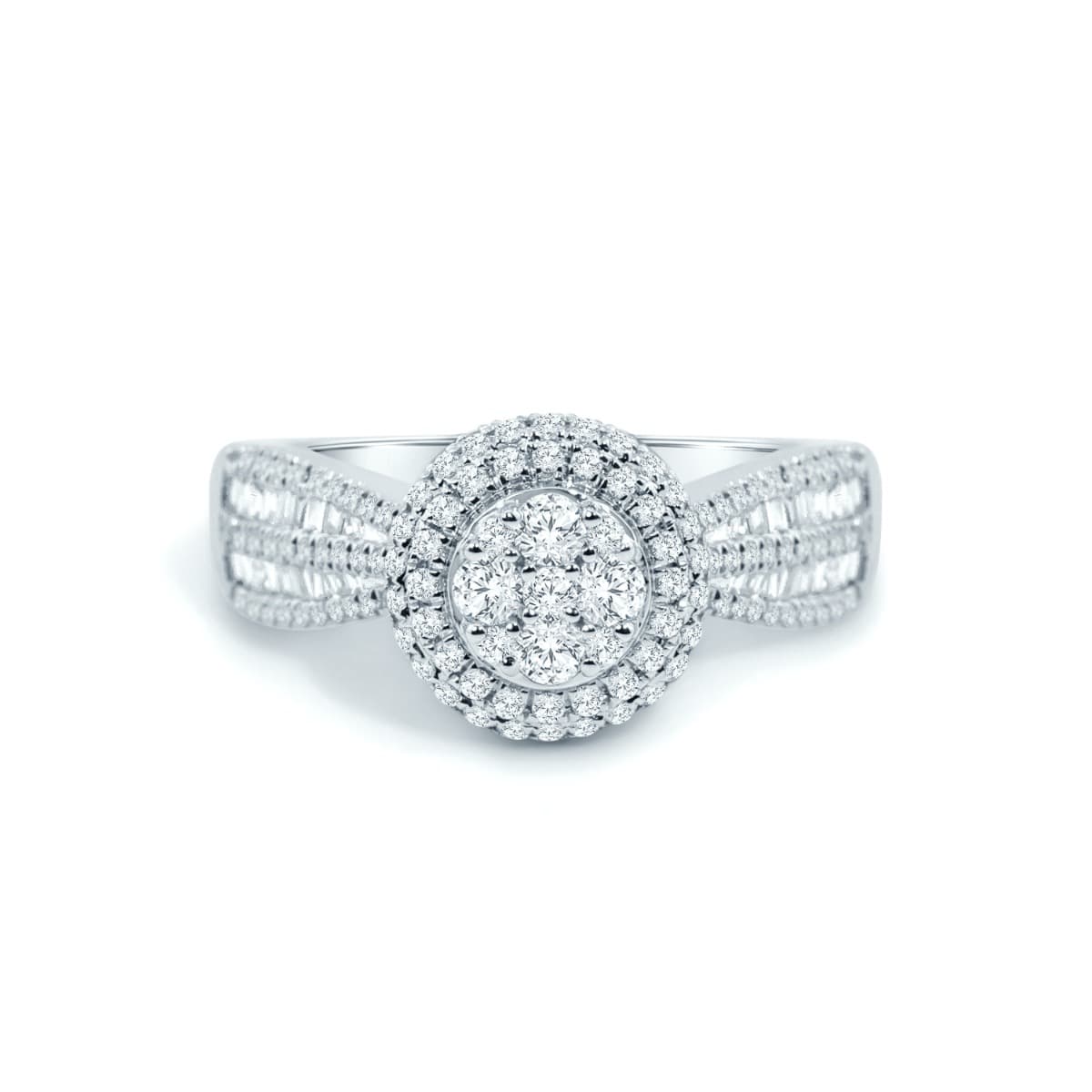 This diamond ring showcases a triple halo surrounding the center round cluster to amplify its sparkle. The alternating arrangement of two – shaped diamonds on the side arms creates a harmonious interplay of light and shape, amplifying the ring’s visual appeal. This is a timeless and elevated choice to honour your commitment.