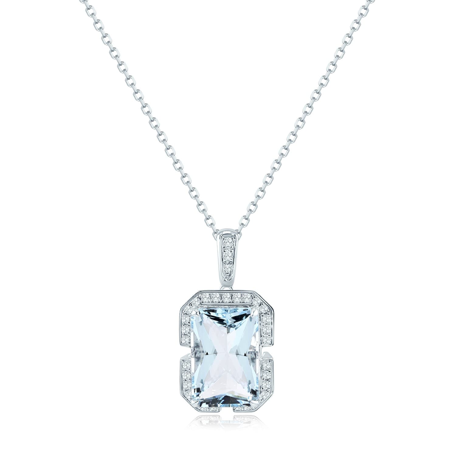 The pendant’s design is both innovative and sophisticated. At its core is a generously – sized, rectangular – cut aquamarine, boasting a captivating light blue hue that mirrors the tranquil expanse of the ocean. The aquamarine is encased in a unique metal frame, which is artfully adorned with smaller diamonds. The frame’s geometric shape adds a modern, edgy touch, contrasting beautifully with the smooth, fluid lines of the gemstone.