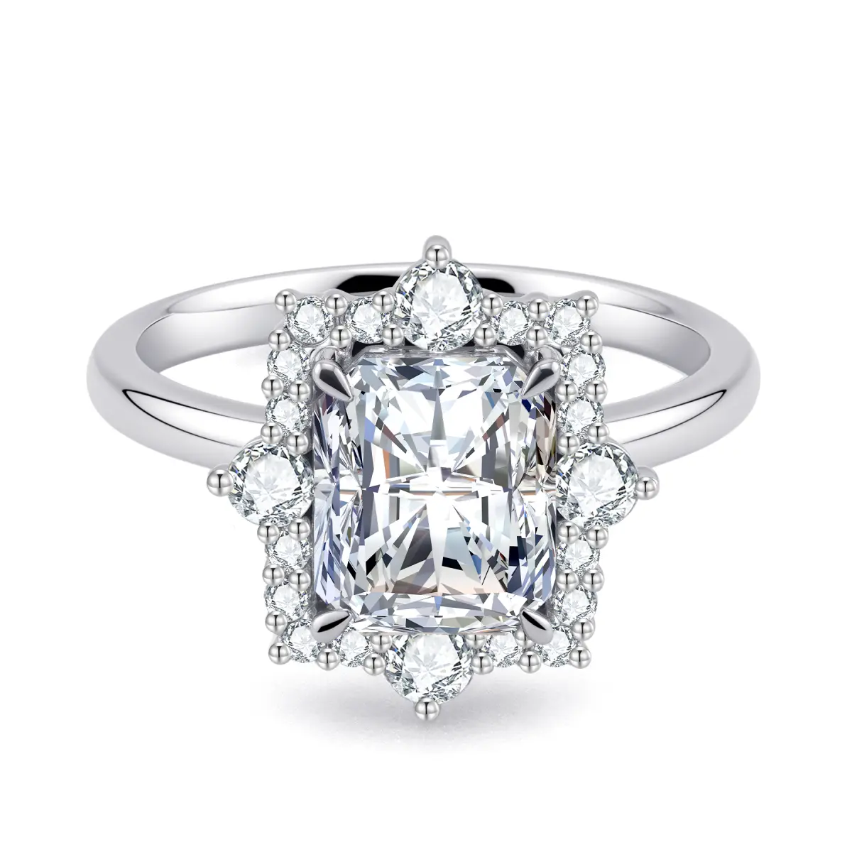 This diamond ring features a 2.02 carats radiant cut center diamond. Surrounded by accent diamonds, weighing a total of 0.30 carats. They are pave – set, clustering around the main stone like stars around a moon, whispering tales of eternal companionship. The close – set arrangement of these smaller diamonds creates a continuous, dazzling constellation, enhancing the ring’s overall opulence and sparkle. When worn on the finger, it’s as if one has tucked a fragment of the galaxy away, a constant reminder of timeless elegance and beauty.