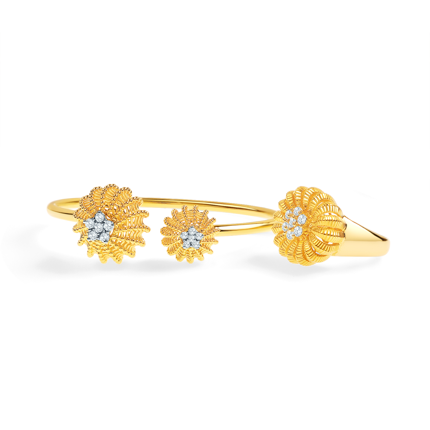 From the Fleur Sculptée collection, this 18K gold bracelet is a tribute to the artistry of nature—where precision meets poetry. Each sculpted bloom unfurls in a symphony of gold, its textured petals radiating like ripples of sunlight. At the center, a constellation of natural diamonds (0.413ct) shimmers with quiet brilliance, echoing the delicate heartbeat of a flower touched by morning light.