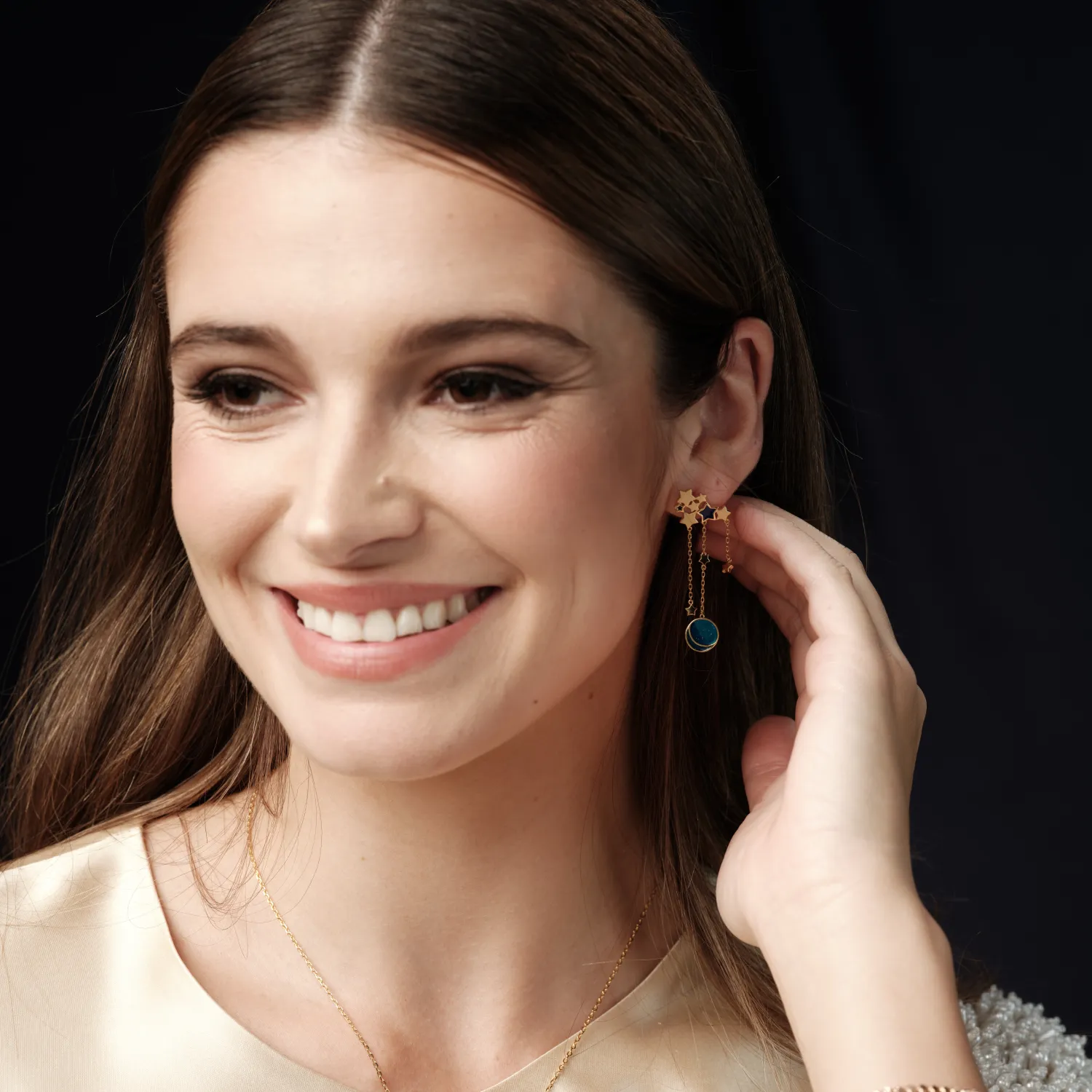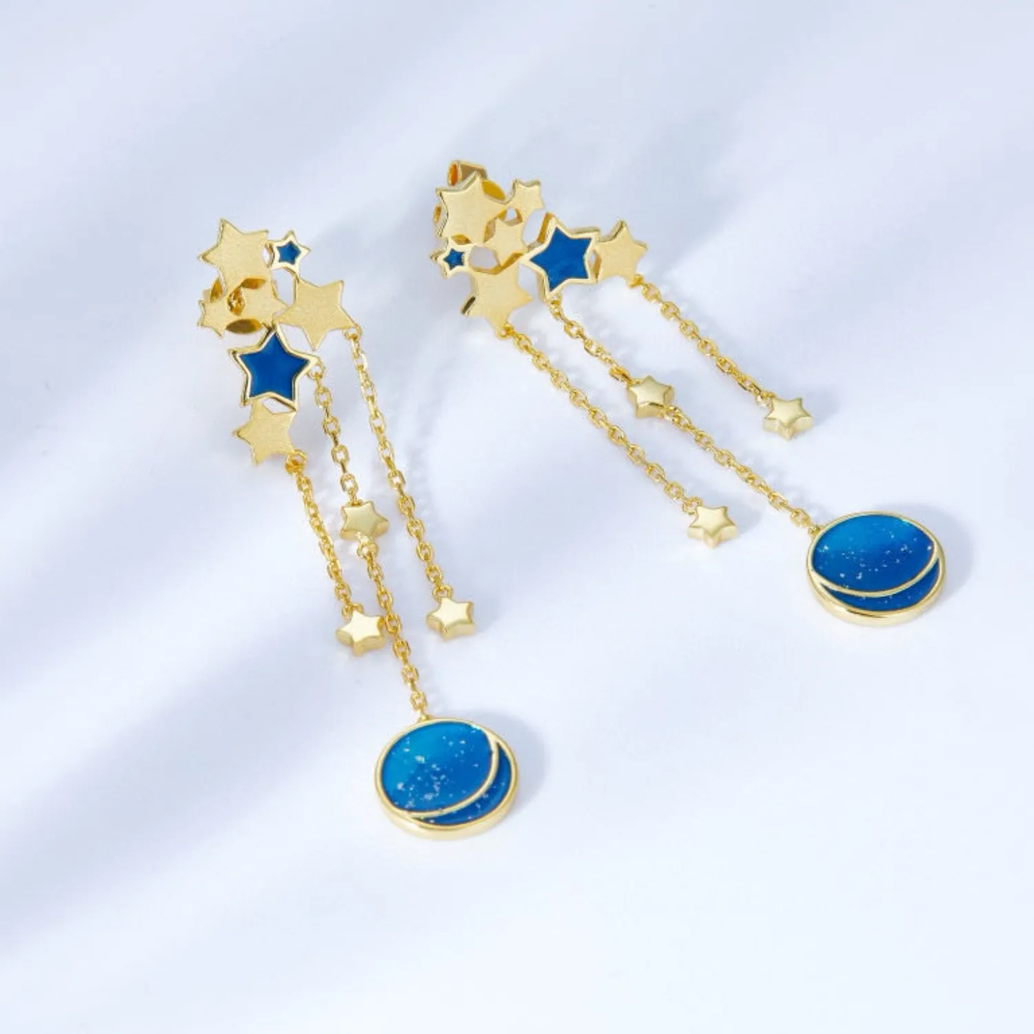 These charming enamel earrings capture the whimsical beauty of a starry night sky. Featuring cascading golden stars and a celestial blue moon disc, the design dances with movement and light. A playful yet elegant piece that brings a touch of cosmic magic to your everyday style.