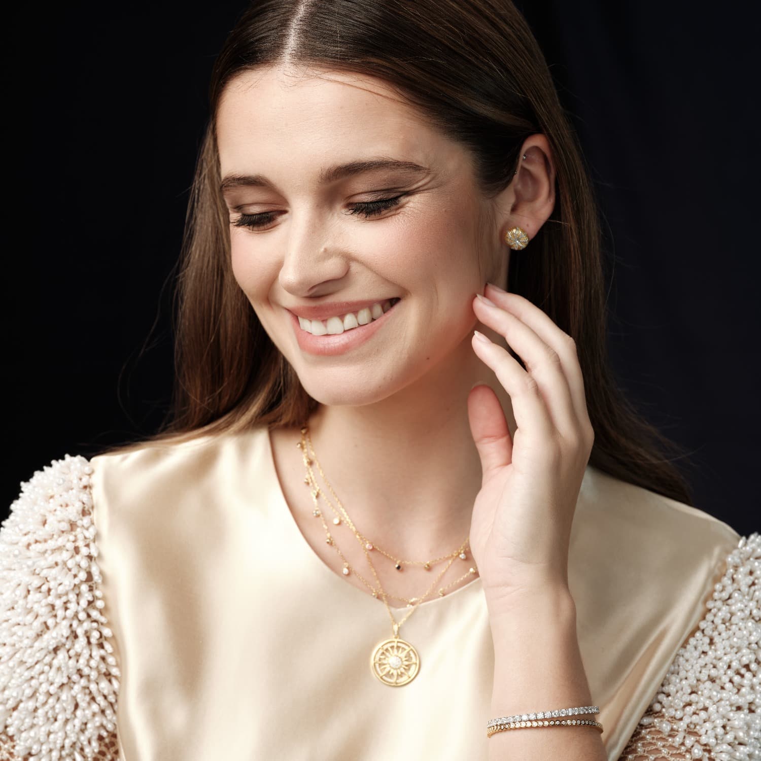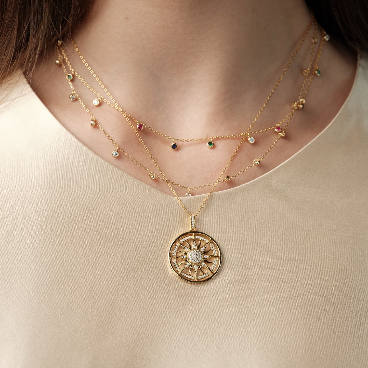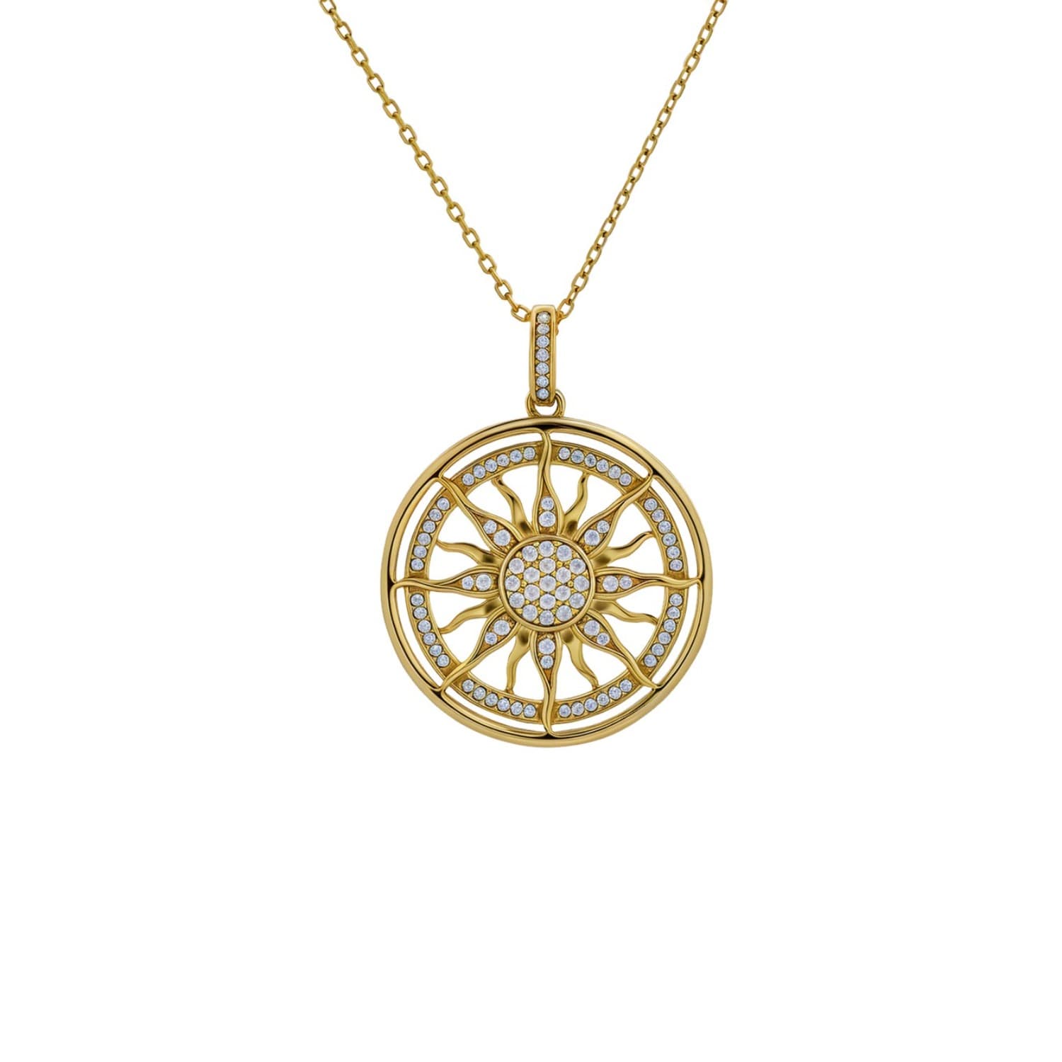 This necklace’s pendant, made of Gold Vermeil, is designed in the shape of the sun. At its core and along the “rays” are inlaid Moissanite diamonds. Symbolizing the sun’s power, it radiates energy and vitality, bringing a sense of strength and warmth to the wearer.